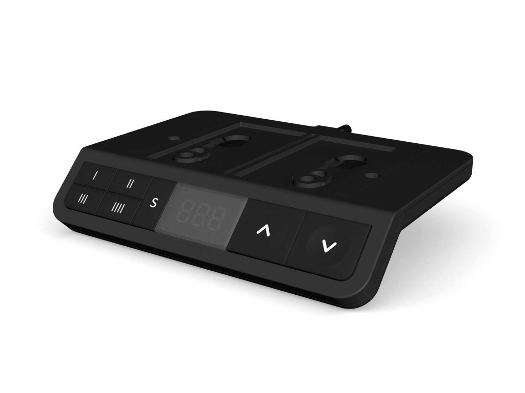The height adjustment is controlled by a controller that offers 4 storage positions, and can be attached to the table top in two ways. Either fixed to the edge of the board, or it can slide under the board.