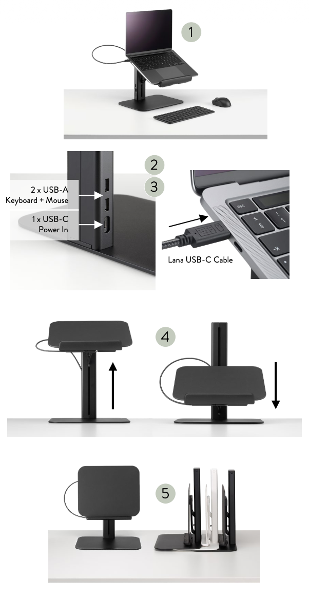 Lana je chytrý a elegantní stojan na notebook, který promění jakýkoli pracovní stůl v pohodlné a zdravé pracovní místo. V kombinaci s bezdrátovou klávesnicí a myší vytváří flexibilní pracovní prostředí – ideální pro rychlé porady i dlouhé hodiny soustředěné práce.