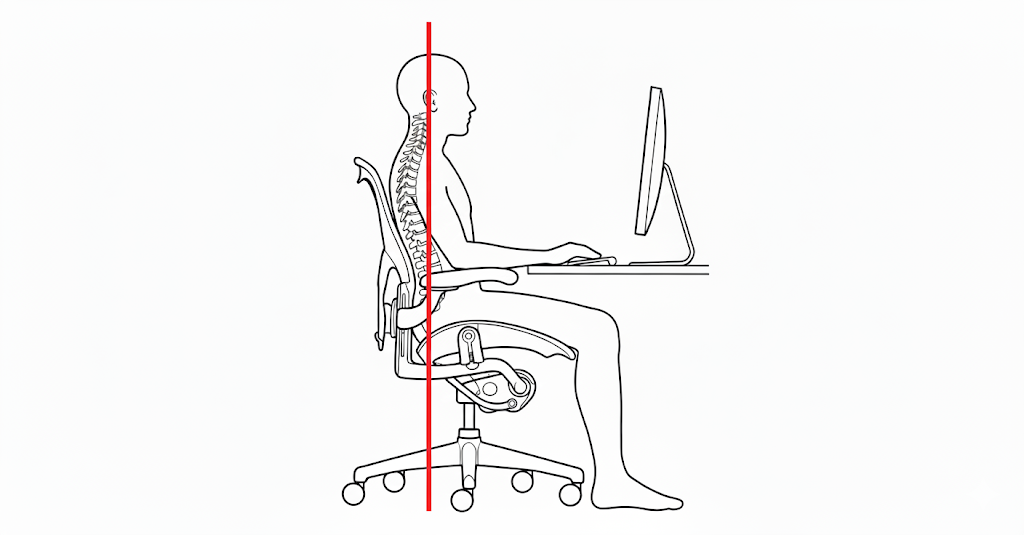 Popisek k obrázku: Správný sed na ergonomické židli. Všimněte si vertikální linie spojující ucho, rameno a kyčel. Hlava je v přirozené rovnováze a nepotřebuje externí oporu.